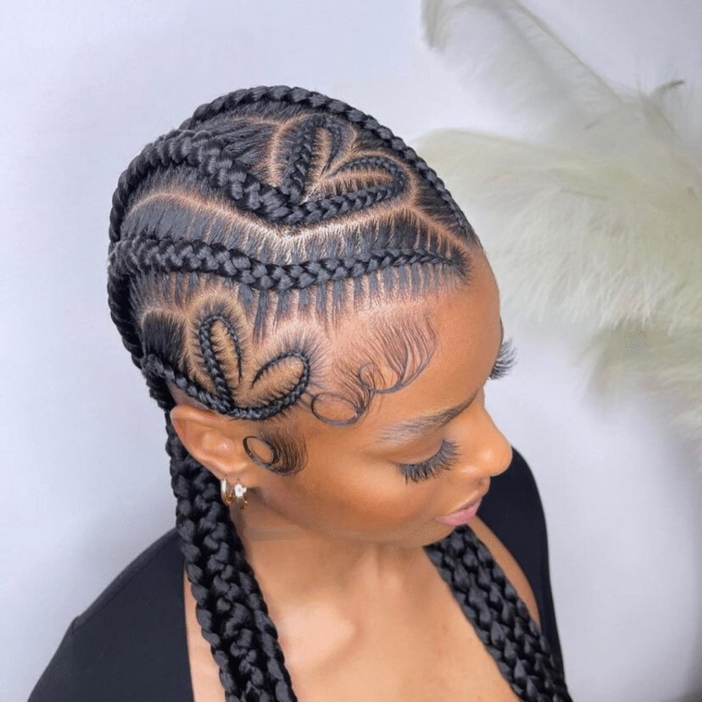 C’est une coiffure protectrice à la fois structurée et audacieuse, idéale pour mettre en valeur la texture naturelle du cheveu.